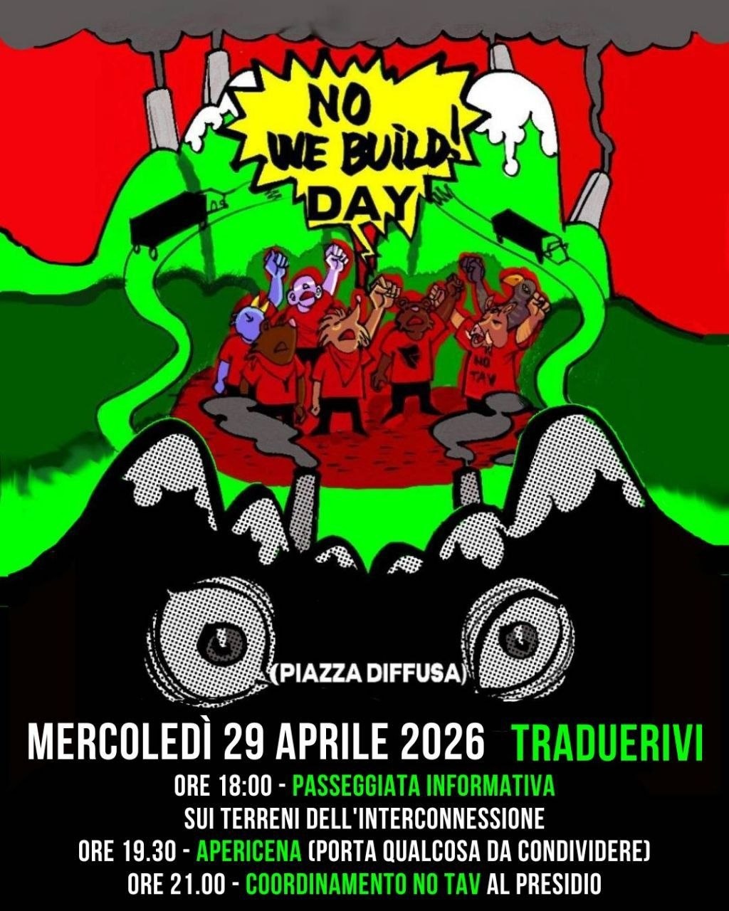 Abbiamo un problema che si chiama Webuild 29 aprile piazza diffusa Traduerivi (Susa) Ore 18:00 - passeggiata informativa sui terreni dell'interconnessione, dal presidio di Traduerivi ai terreni di Farmacia Viva. Partiamo puntuali! Ore 19.30 - apericena (porta qualcosa da condividere) Ore 21.00 - coordinamento No Tav al presidio di Traduerivi https://www.facebook.com/share/p/1GyswJJkXo/