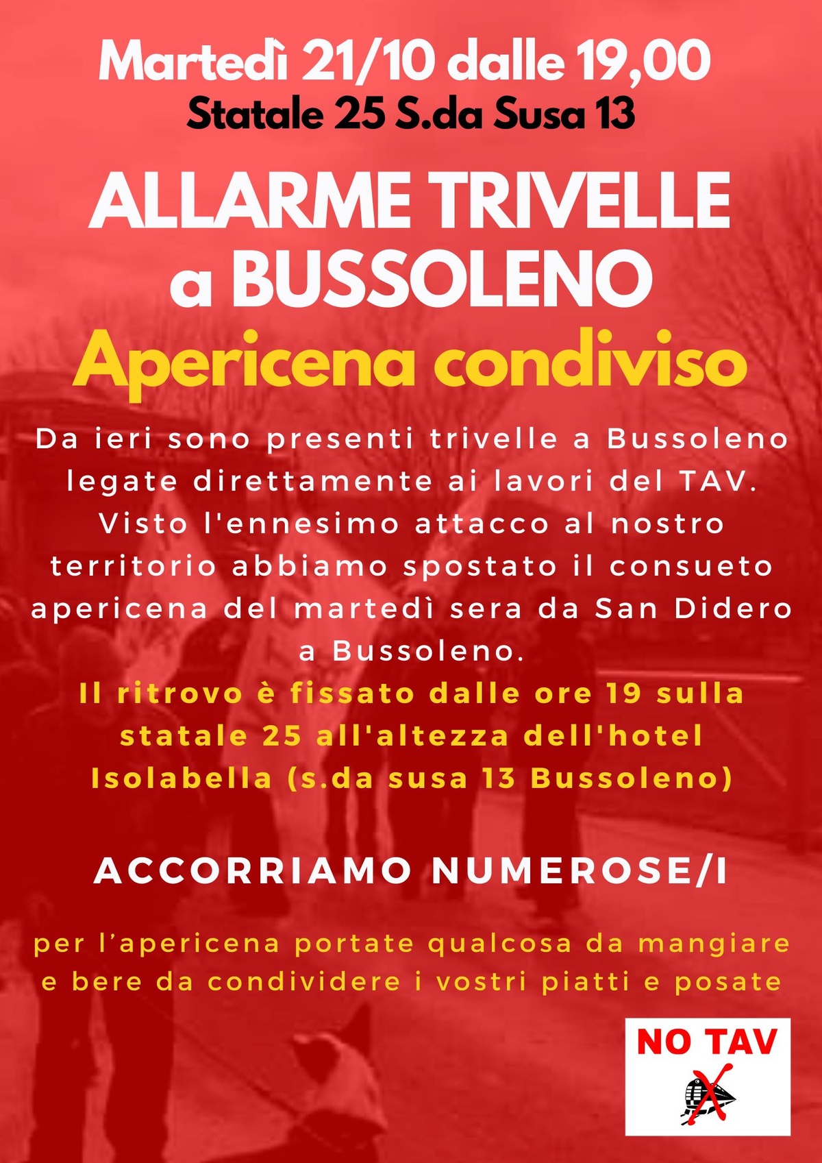 Da ieri sono presenti trivelle a Bussoleno legate direttamente ai lavori del TAV. Visto l'ennesimo attacco al nostro territorio abbiamo spostato il consueto apericena del martedì sera da San Didero a Bussoleno.