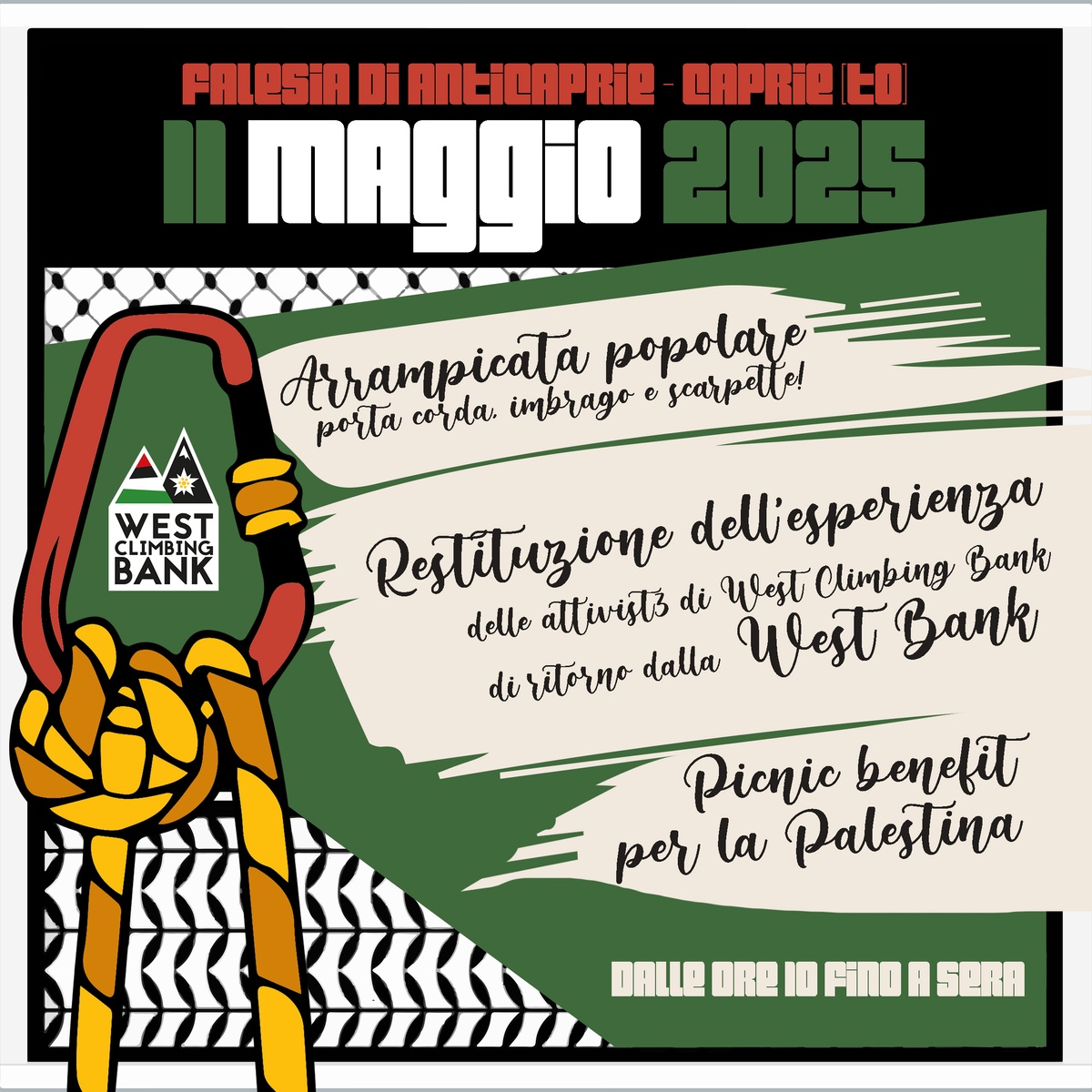 Domenica 11 maggio dalle ore 10 ci troveremo in Val Susa per una giornata di sport popolare in solidarietà con la Palestina. Insieme alle attiviste e agli attivisti di West Climbing Bank scaleremo le pareti di roccia della falesia di Anticaprie, e potremo ascoltare la restituzione dell’esperienza delle attiviste e attivisti di West Climbing Bank di ritorno dalla Palestina.