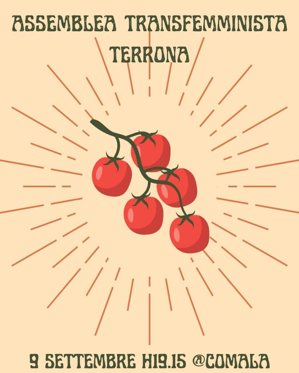 Dopo la pausa estiva, ci ritroviamo martedì 9 settembre alle ore 19:15 al Comala per la prossima Assemblea Transfemminista Terrona. L'assemblea sarà non mista e chiediamo, quindi, alle persone non terrone e agli uomini etero cis di non partecipare in quanto è nostra volontà rivendicarci lo spazio.