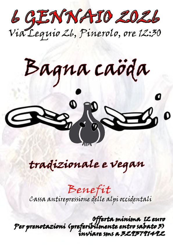 Bagna Caöda Beneft Cassa Antirepressione Alpi Occidentali dalle ore 12:30 Presso il centro sociale di Via Lequio 26 a Pinerolo. Per prenotazioni inviare un sms preferibilmente entro il 03/01/2026 al +39 3293791492