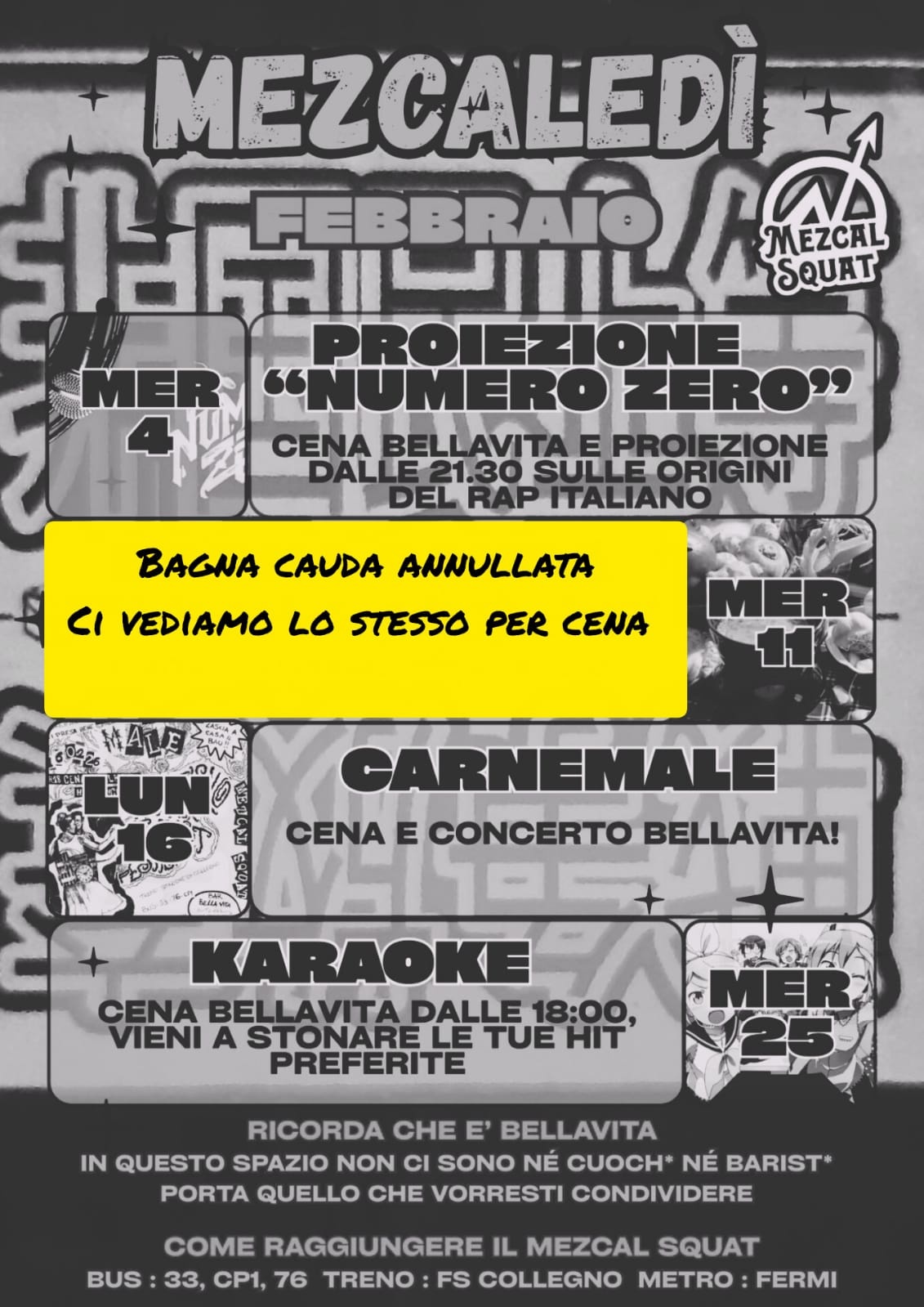 Il Mezcal Squat è uno spazio autogestito e le attività svolte al suo interno si basano sulla condivisione. Non vi è circolo di denaro. Porta quello che vorresti trovare. Utilizza la cucina e prepara quello che vuoi da mangiare.