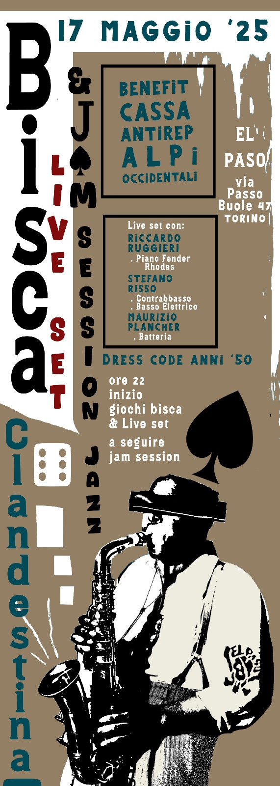 BISCA CLANDESTINA + LIVE SET JAZZ & JAM SESSION JAZZ, BENEFIT CASSA ANTIrEPRESSIONE DELLE ALPI OCCIDENTALI.
