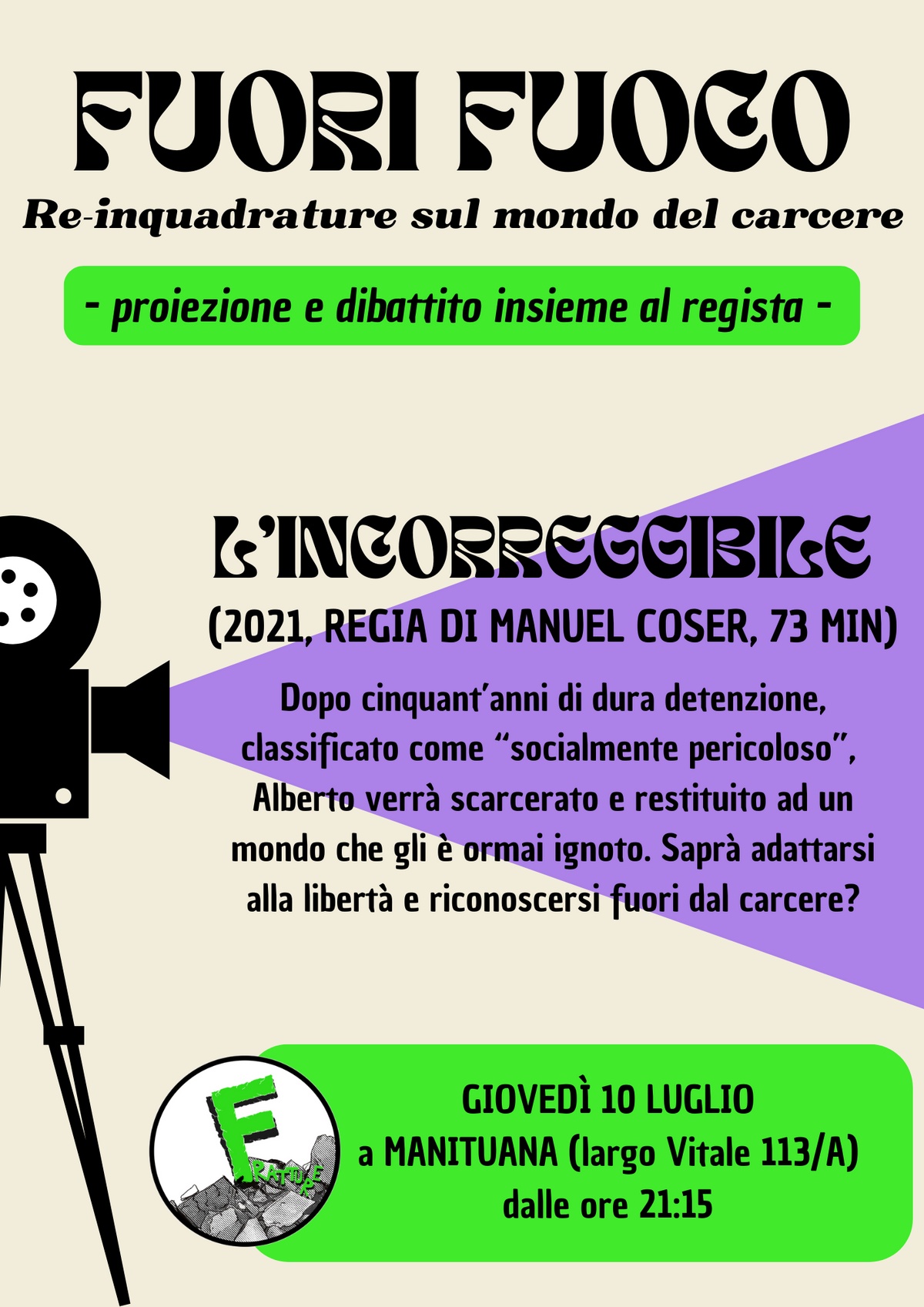 La seconda proiezione del cineforum organizzato dalla newsletter indipendente Fratture, che racconta il mondo del carcere e le sue contraddizioni. Guardiamo e discutiamo insieme "L'incorreggibile", un film di Manuel Coser del 2021 che porta sullo schermo la storia di Alberto, scarcerato dopo cinquant'anni di detenzione.