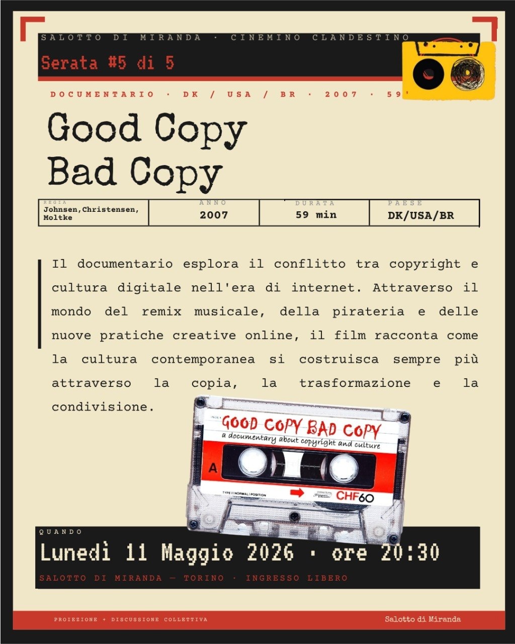 Good Copy Bad Copy chiude il cerchio con una domanda pratica e urgente: in un’epoca in cui tutta la cultura è copia, remix, campionamento, mashup, chi ha il diritto di decidere cosa è lecito? Il film gira il mondo tra produttori di musica brasiliani, pirati nigeriani e giuristi americani, costruendo un ritratto del conflitto tra copyright e creatività che è, in fondo, il conflitto tra chi vuole privatizzare la cultura e chi vuole che resti comune.