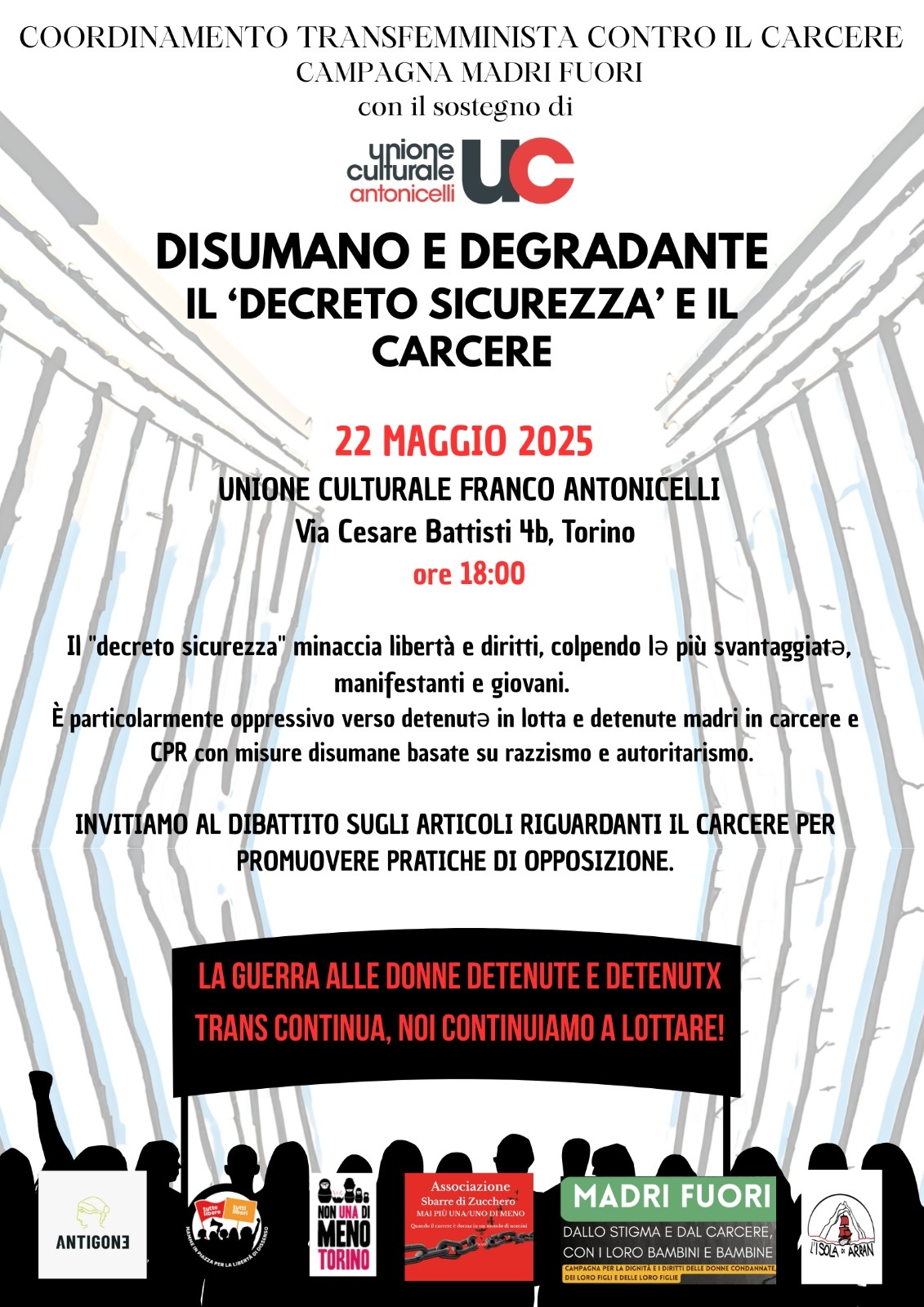 serata/dibattito su carcere e decreto sicurezza organizzato dal Coordinamento transfemminista contro il carcere composto da organizzazioni, comitati e singol3 che da anni si battono per i diritti delle persone detenute e, in particolare, delle donne e persone trans detenute nella sezione femminile delle Vallette e sezione trans di Ivrea (Mamme in piazza, Sbarre di Zucchero, Non una di meno, Isola di Arran, campagna Madri Fuori, Antigone)