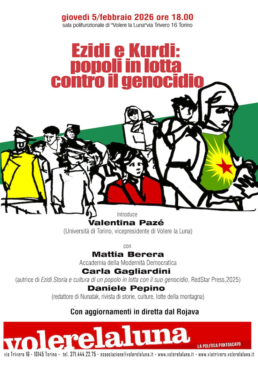 ”Ezidi e Kurdi: popoli in lotta contro il genocidio” Introduce Valentina Pazé (Università di Torino, vicepresidente di Volere la Luna) con Carla Gagliardini (autrice di Ezidi.Storia e cultura di un popolo in lotta con il suo genocidio, RedStar Press,2025) Daniele Pepino (redattore di Nunatak, rivista di storie, culture, lotte della montagna)