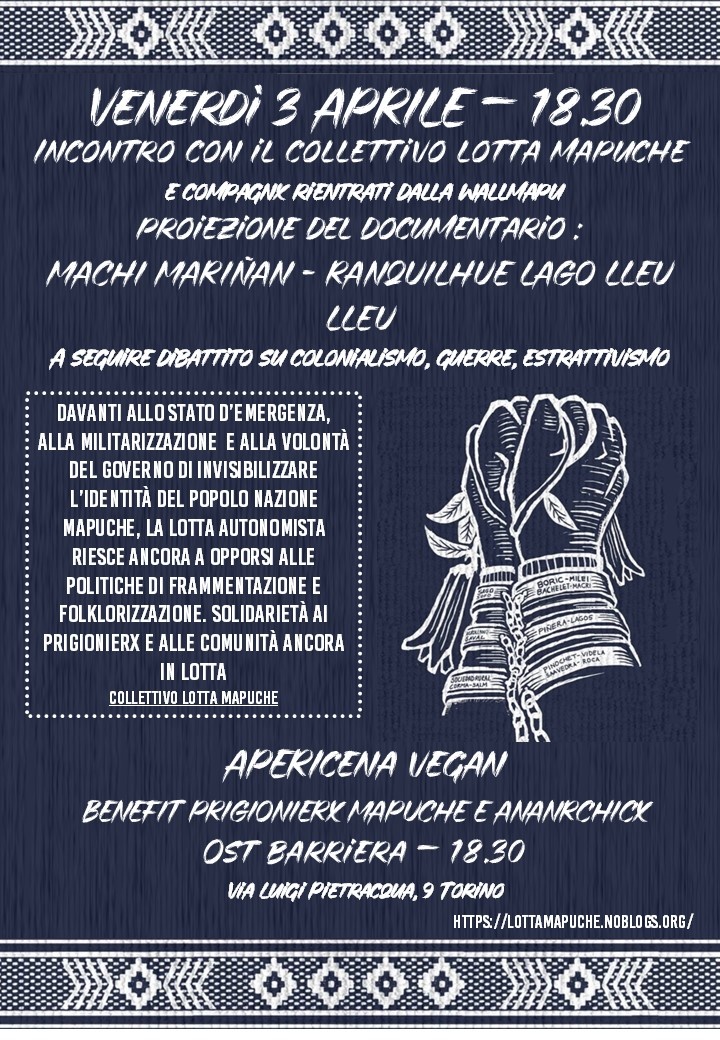 Spesso organizziamo incontri pubblici per aggiornarvi della lotta autonomista Mapuche in Wallmapu, ma riteniamo che non sia sufficiente fare controinformazione, motivo per cui il ricavato economico di questa iniziativa andrà alle comunità in lotta che ancora resistono alle innumerevoli politiche di frammentazione e musealizzazione, e che per mezzo dell’azione diretta contundente ed incisiva, difendono la propria esistenza. Inoltre forniamo sostegno ai prigionieri mapuche, ai sovversivi e alle individualità anarchiche rinchiuse nelle galere presenti su un territorio occupato dallo stato cileno.