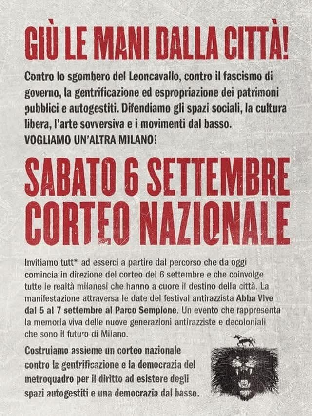 Contro lo sgombero del Leoncavallo, contro il fascismo di governo, la gentrificazione ed espropriazione dei patrimoni pubblici e autogestiti.