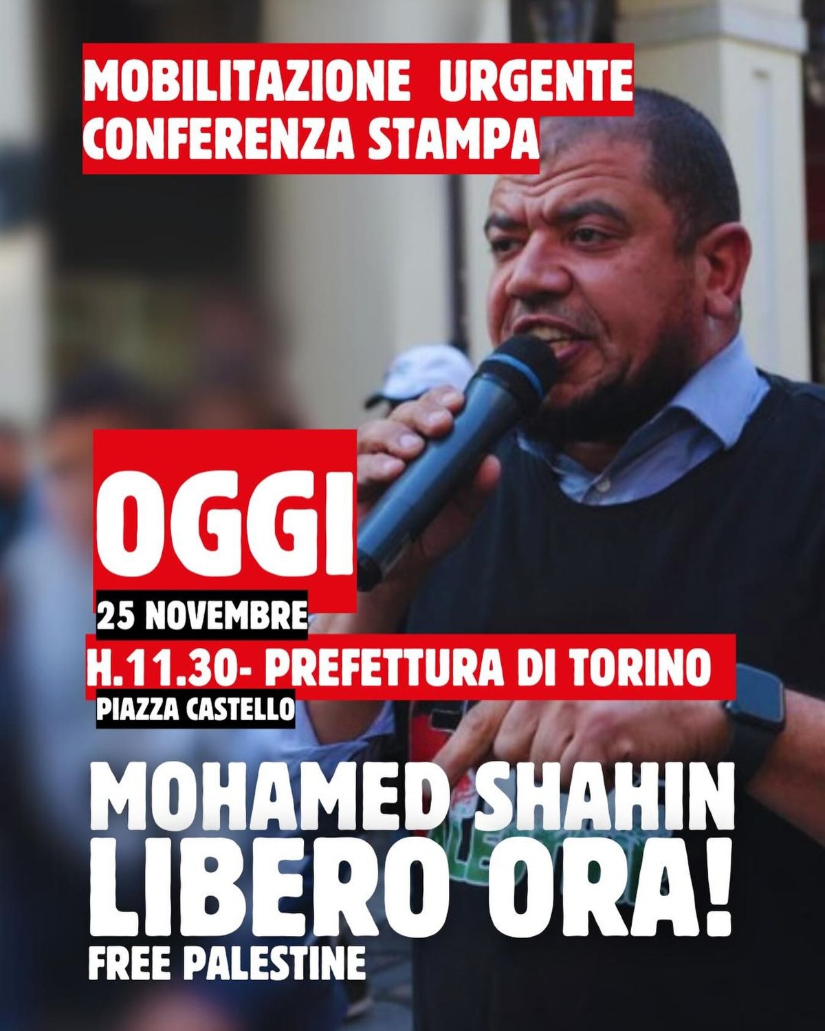 MOHAMED SHAHIN LIBERO SUBITO! 25 Novembre - Ore 11:30 - Piazza Castello Abbiamo appreso poche ore fa dell’arresto di Mohamed Shahin, amico e compagno da sempre impegnato nella lotta per la liberazione della Palestina. Questa mattina Mohamed è stato prelevato, arrestato e condotto al Centro di Permanenza per il Rimpatrio di Torino. Mohamed è stato arrestato dopo due anni di mobilitazioni in cui non ha mai smesso di esporsi pubblicamente contro il genocidio in corso in Palestina. A Mohamed è stato revocato il permesso di soggiorno di lunga durata e imposta una deportazione immediata verso l’Egitto: un paese in cui non può tornare, dove il regime dittatoriale di al-Sisi – da lui ripetutamente denunciato per corruzione e per il suo esplicito sostegno allo Stato colonialista di Israele – lo esporrebbe a rischio concreto di arresto, tortura e detenzione a vita. Nonostante la sua richiesta di asilo politico, il giudice ha confermato la deportazione, ignorando ogni evidenza del pericolo reale e documentato che Mohammad correrebbe. Sappiamo che Mohamed non è un caso, ma una chiara volontà politica: fermare chi in questi anni si è mobilitato contro il genocidio in Palestina. Mohamed è stato preso di mira non solo per il suo impegno politico ma anche perché Imam di una moschea di Torino. Ancora una volta, la propaganda islamofoba diventa strumento per zittire chi alza la voce e rifiuta di abbassare la testa. Mohamed non ha mai accettato di restare in silenzio di fronte a oltre due anni di massacri. Per questo oggi viene arrestato e minacciato di espulsione verso un regime dittatoriale. Il suo unico “reato” è aver gridato insieme a tutti noi la libertà per la Palestina, aver denunciato la brutalità del colonialismo israeliano, la complicità internazionale e la corruzione dei governi arabi.
