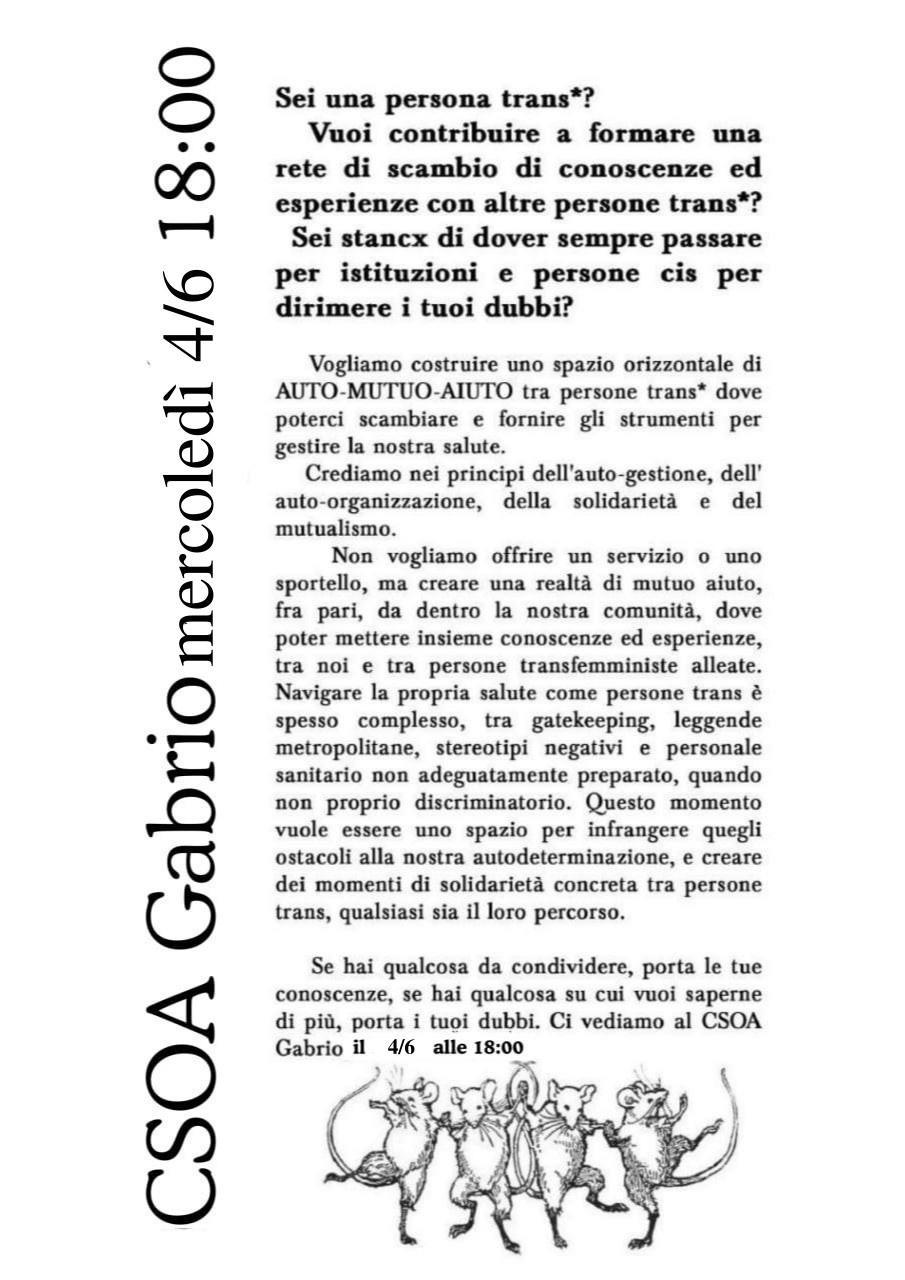 Non vogliamo offrire un servizio o uno sportello, ma creare una realtà di mutuo aiuto, fra pari, da dentro la nostra comunità, dove poter mettere insieme conoscenze ed esperienze, tra noi e tra persone transfemministe alleate. Navigare la propria salute come persone trans è spesso complesso, tra gatekeeping, leggende metropolitane, stereotipi negativi e personale sanitario non adeguatamente preparato, quando non proprio discriminatorio. Questo momento vuole essere uno spazio per infrangere quegli ostacoli alla nostra autodeterminazione, e creare dei momenti di solidarietà concreta tra persone trans, qualsiasi sia il loro percorso.