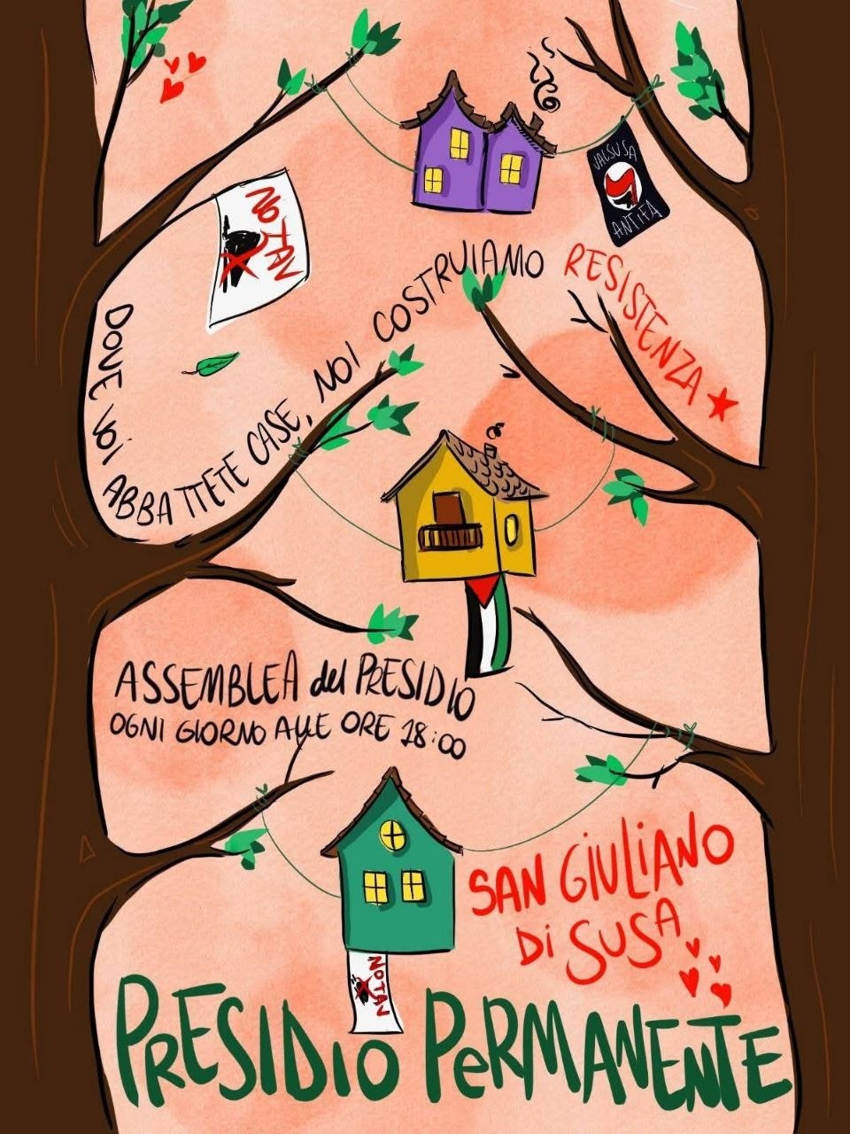 "A SAN GIULIANO NASCE UN NUOVO PRESIDIO PERMANENTE! A San Giuliano sta succedendo qualcosa che riguarda ognuno di noi: un intero pezzo di territorio viene messo sotto pressione, tra espropri, prese di possesso di case, futuri cantieri e decisioni calate dall’alto che ignorano la vita delle persone che qui abitano e abitavano. [...] Invitiamo tutti e tutte a passare, portare presenza, idee, cibo caldo, musica, parole. A far vivere questo luogo ogni giorno, perché un territorio che resiste insieme è più forte di qualsiasi grande opera imposta. Dove abbattono case, noi costruiamo resistenza! A San Giuliano non è finita, la comunità resta, sorveglia e lotta!"