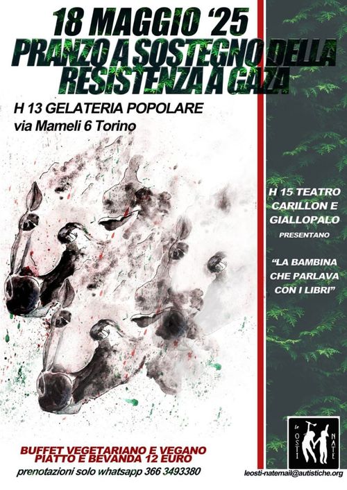 Vi aspettiamo domenica 18 maggio 2025 alle ore 13 con un buffet vegano e vegetariano a 12€, bevanda inclusa. Tutto il ricavato andrà a sostegno della popolazione della striscia di Gaza attraverso il collettivo spagnolo di riflessione-azione Sumud_jerez. Il collettivo, con i suoi contatti diretti nella zona, sostiene attività di prima necessità, indispensabili al popolo palestinese che con fermezza e perseveranza resiste al brutale genocidio che sta subendo da lungo tempo.