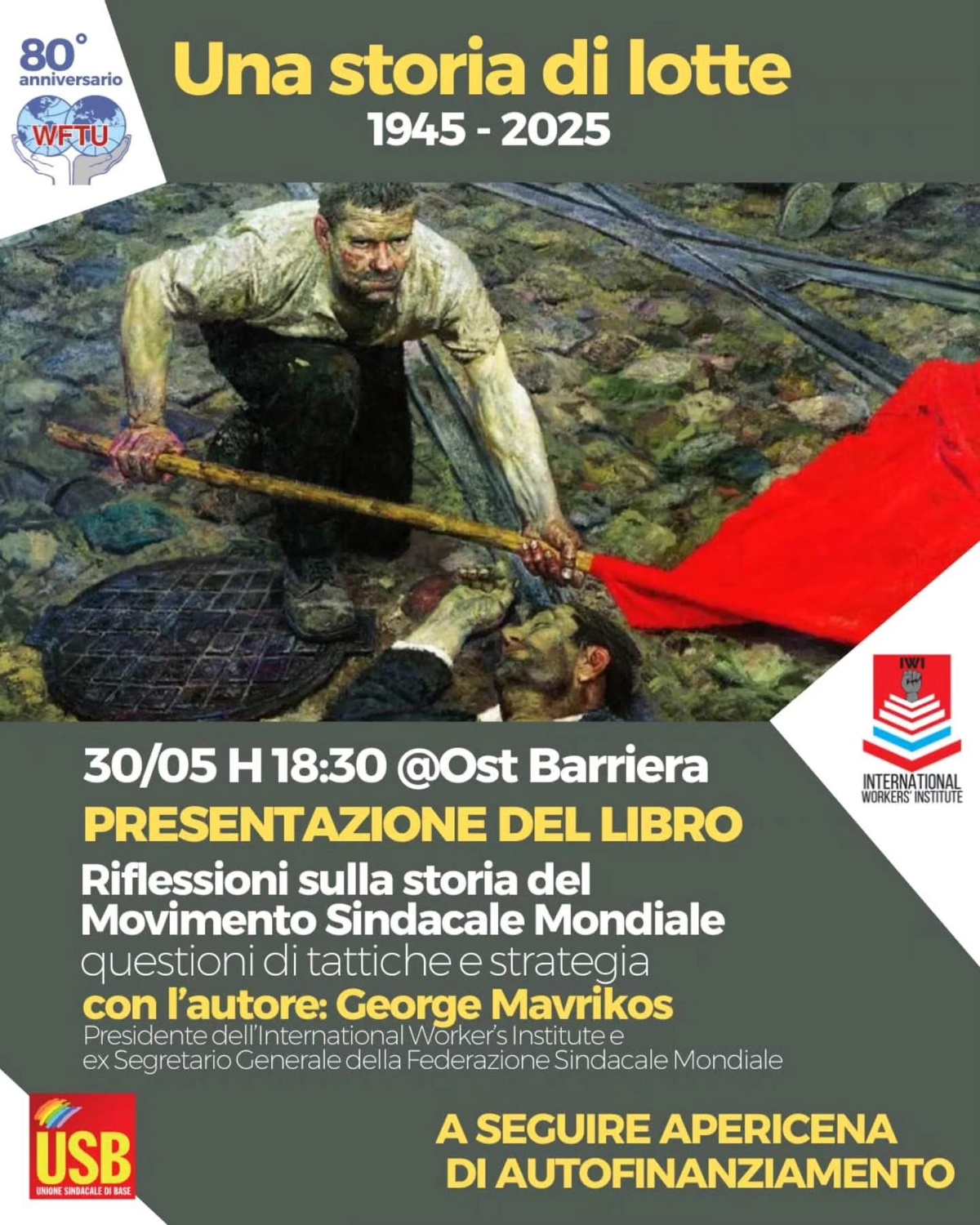 Per celebrare gli 80 anni della storica organizzazione internazionale dei lavoratori, la FSM (Federazione sindacale Mondiale), e i suoi 110 milioni di aderenti, la sua storia di lotte internazionaliste, per la pace, antimperialiste, avremo l'onore di ospitare George Mavrikos, storico presidente dell'organizzazione e protagonista del suo rilancio da fine anni '80 del Novecento ad oggi.