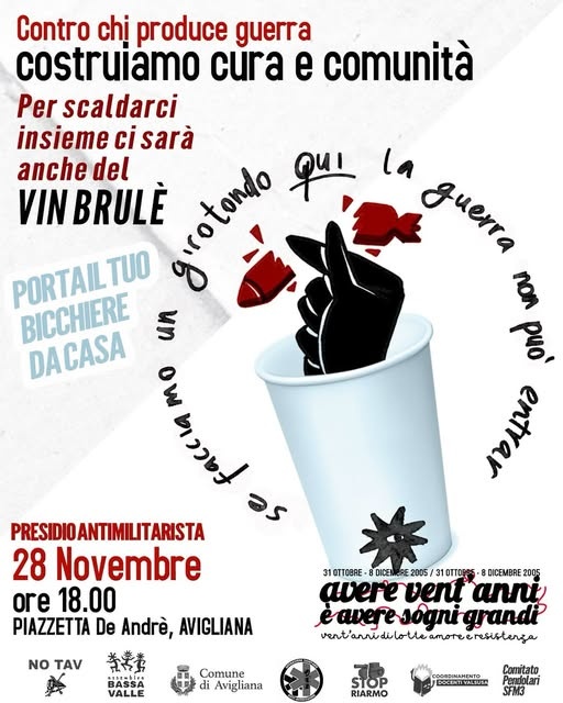 Venerdì 28 novembre alle ore 18.00 Presidio Antimilitarista in Piazzetta De André ad Avigliana: