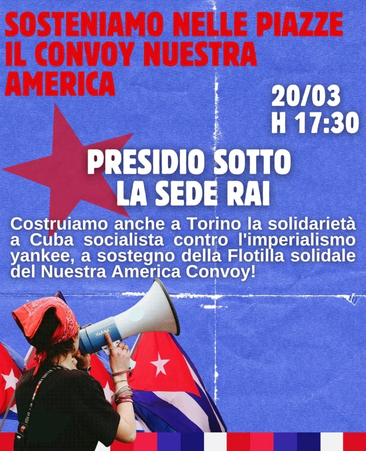 Per questo il 20 marzo alle 17:30 saremo in presidio davanti alla Rai (Via Verdi 16), a sostegno del Convoy solidale che arriverĂ il 21 marzo a L'Avana e contro la complicitĂ del governo Meloni con il bloqueo criminale imposto dagli Stati Uniti.