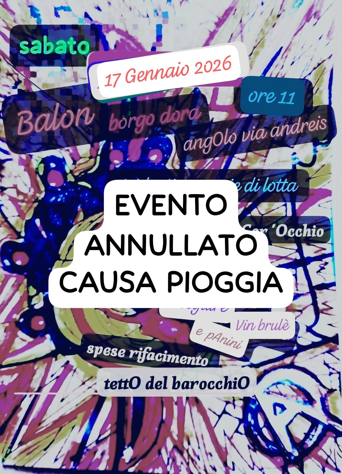 "Stridenti armonie di lotta" è l'appuntamento mensile, alle ore 11, al Balon, Borgo Dora angolo Via Andreis, a cura del Cor'okkio ".....la sempre più pesante e orrida realtà induce a uscire nelle strade con canti di lotta e letture, per denunciare l'intollerabile ed ingiusta persecuzione da parte dei poteri attraverso ogni forma di repressione.