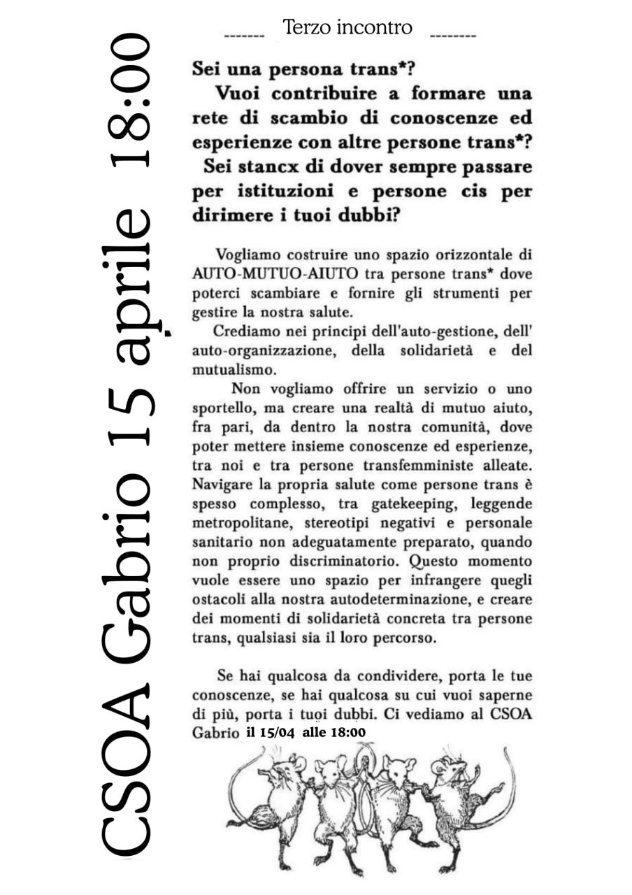 Se hai qualcosa da condividere, porta le tue conoscenze, se hai qualcosa su cui vuoi saperne di più, porta i tuoi dubbi. Ci vediamo al CSOA Gabrio, il 15/04, ore 18! ❤️🧚