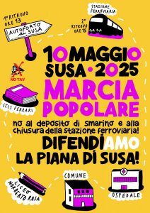MARCIA POPOLARE: difendiamo la Piana di Susa! No al deposito di smarino e alla chiusura della stazione! Saturday, May 10, 01:00 PM-06:30 PM Saturday 10 May 18:30 Susa (TO) TBD corteovalsusanotavmarcia popolare