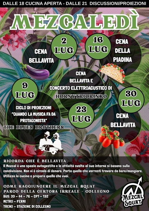 MEZCALEDI' cena della piadina Wednesday, Jul 16, 06:00 PM-01:00 AM Thursday 17 July 01:00 Mezcal Squat, Parco della Certosa, Collegno Mezcal Squat, Parco della Certosa, Collegno BELLAVITAbellavita