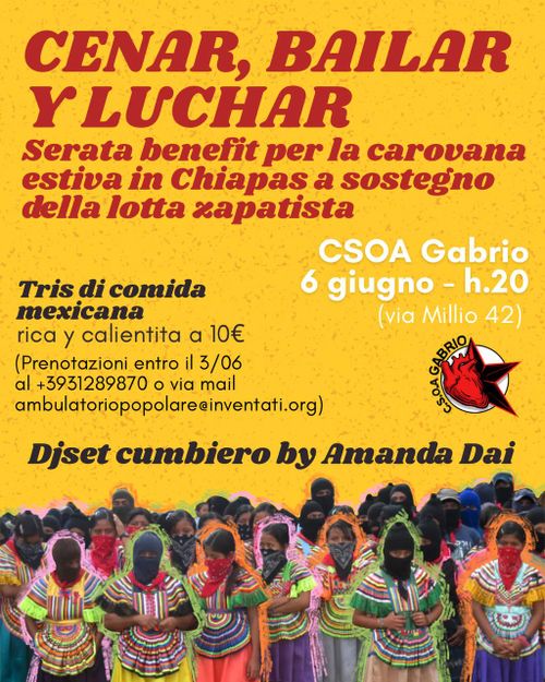 Cenar, Baylar e Luchar Friday, Jun 06, 08:00 PM-12:00 AM Saturday 7 June 00:00 Csoa Gabrio Via Millio 42, Torino djsetCarovana zapatistaCena benefitzapatismo