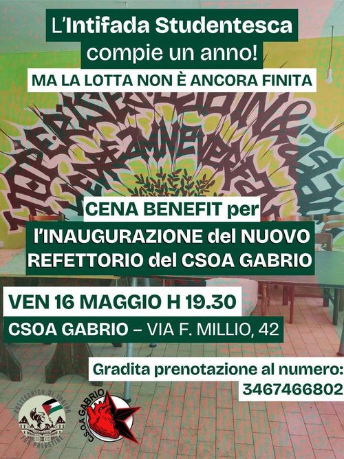 Compleanno Intifada & Inaugurazione refettorio CSOA Gabrio Friday, May 16, 07:30 PM-12:00 AM Saturday 17 May 00:00 Csoa Gabrio Via Millio 42, Torino Free PalestineIntifada studentescaCena benefit
