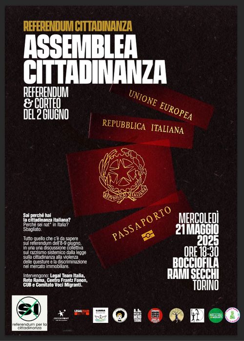 Assemblea cittadinanza - Referendum & Corteo del 2 giugno Wednesday, May 21, 06:30 PM-08:30 PM Wednesday 21 May 20:30 bocciofila rami secchi lungo dora colletta 39 antirazzismocittadinanza